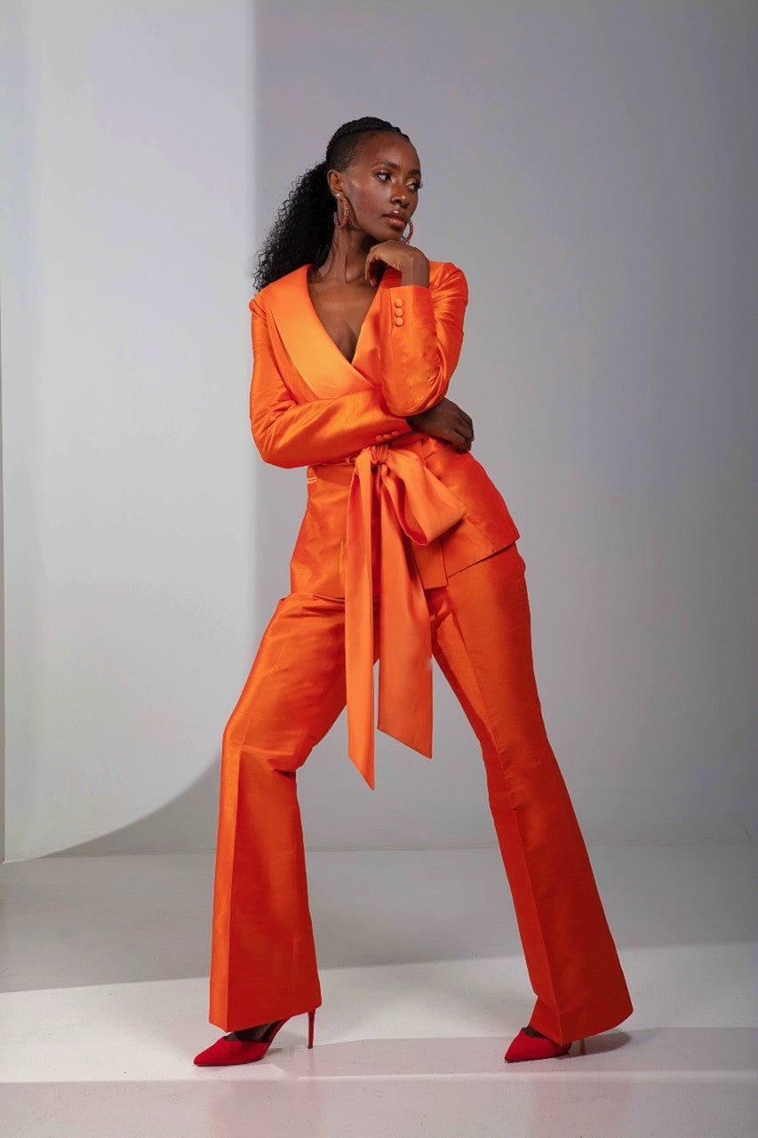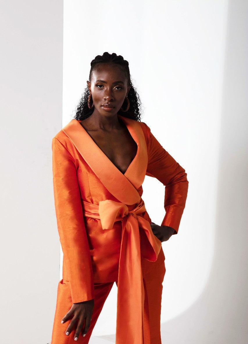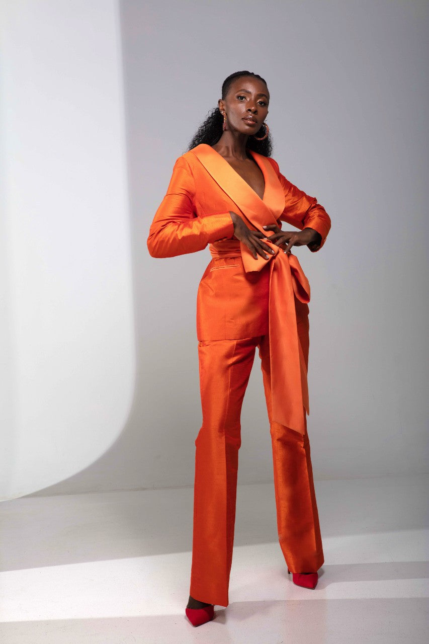 The "Ambre" suit is an outstanding shade of orange. The entire suit is made from pure raw silk.