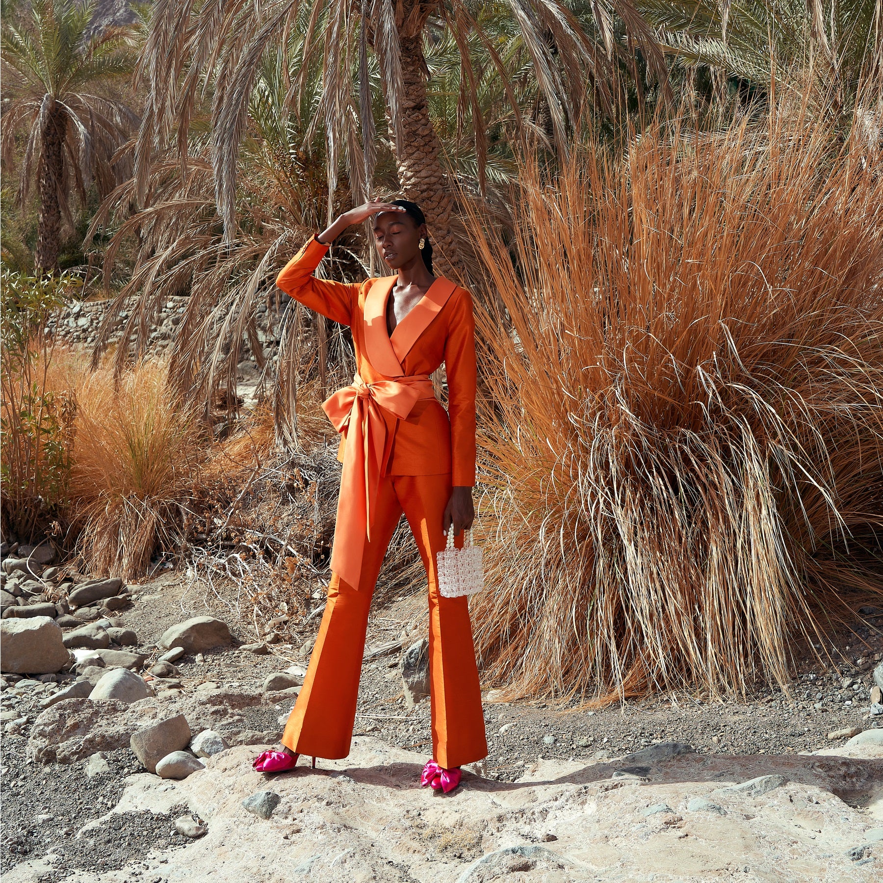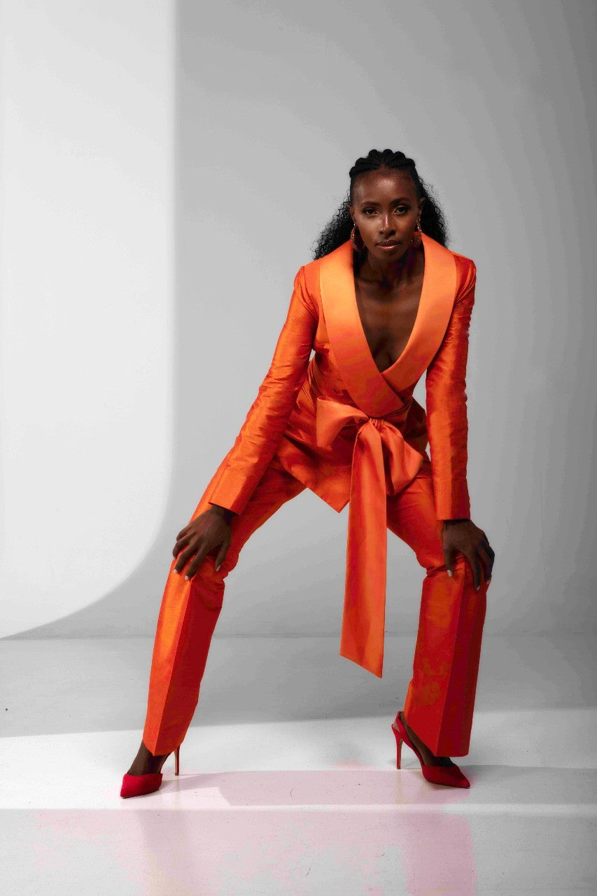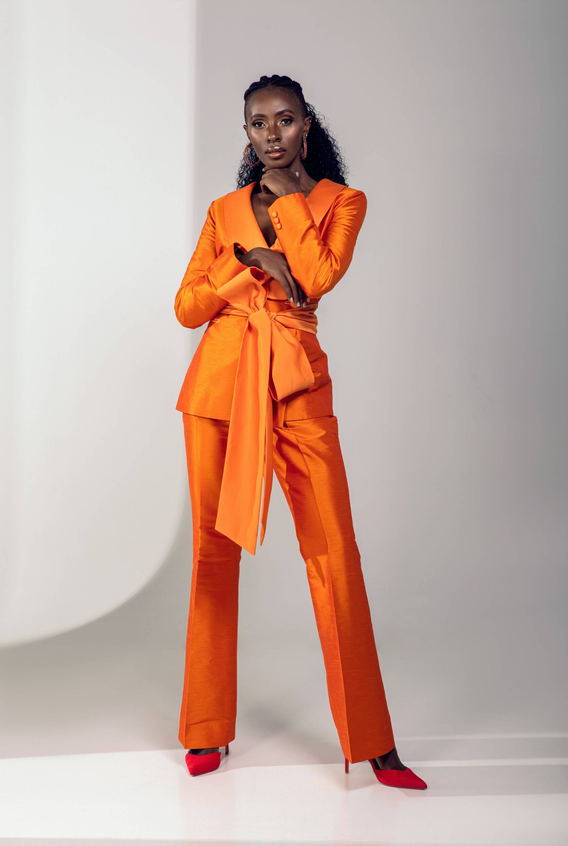 The "Ambre" suit is an outstanding shade of orange. The entire suit is made from pure raw silk.