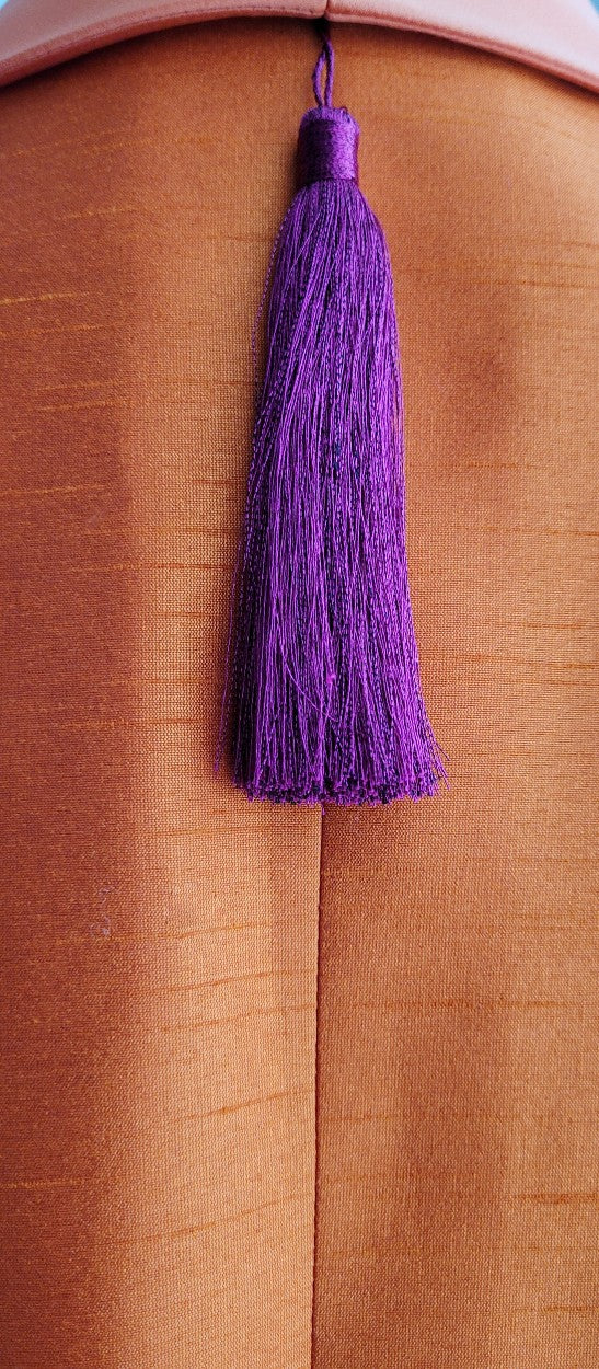 This piece is representative of the sunset- a time of reflection and it combines satin on silk with our kimono style cut silhouette, satin lapels, button and dramatic belt detail on the blazer. She also has a stunning fuchsia tassel accent at the back neck yoke and of course, is completely lined with our signature leopard print silk.
