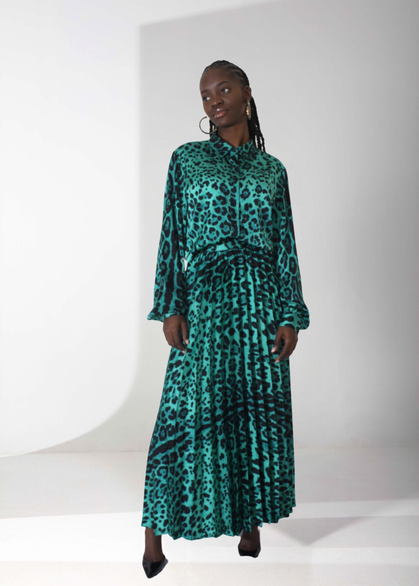 Made of rich and smooth silk, the blouse has a gorgeous billowy sleeve and the skirt is a midi length accordion pleat style. Additionally- the set also comes with our signature mid-rise shorts in a flattering silhouette should you desire.