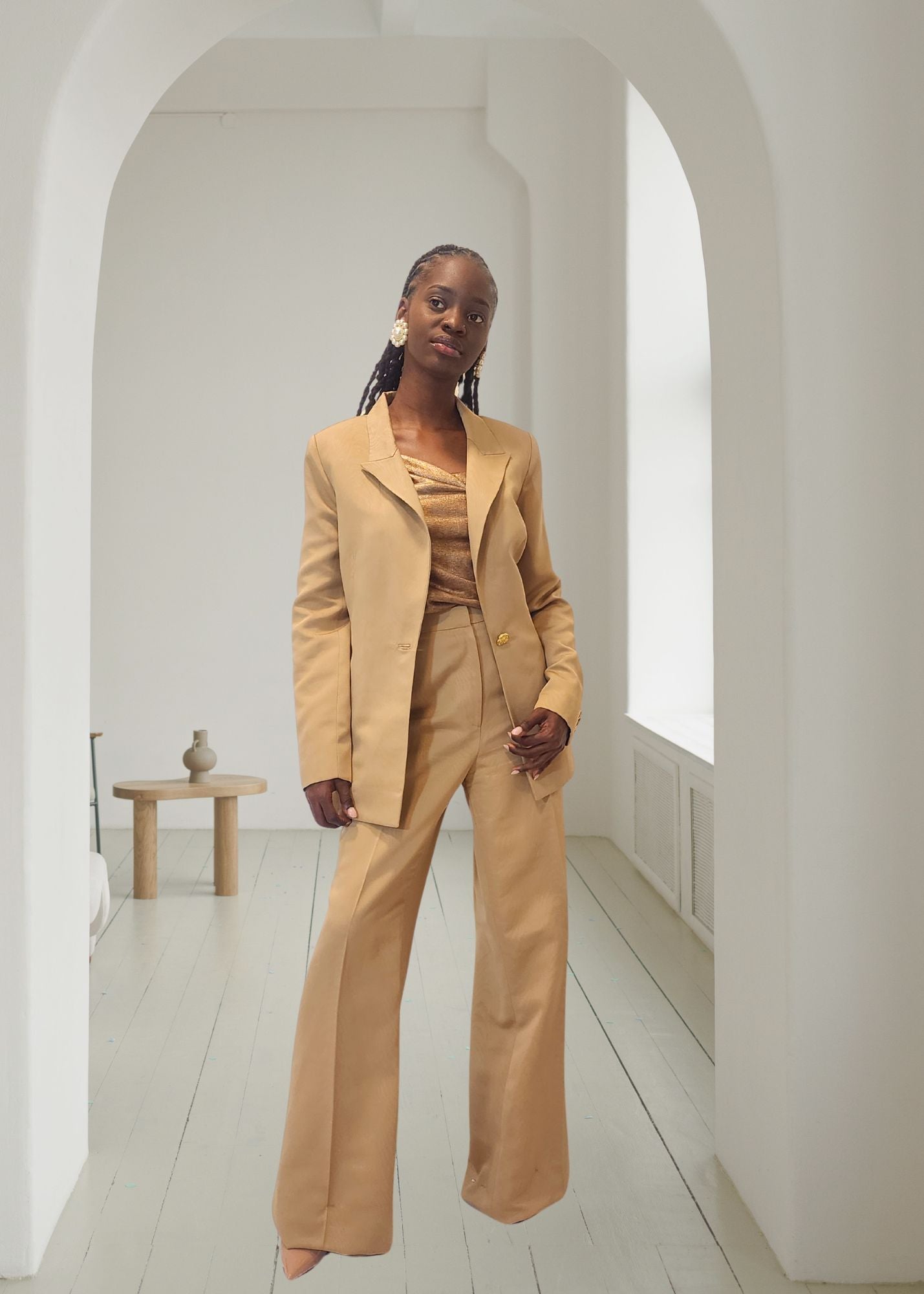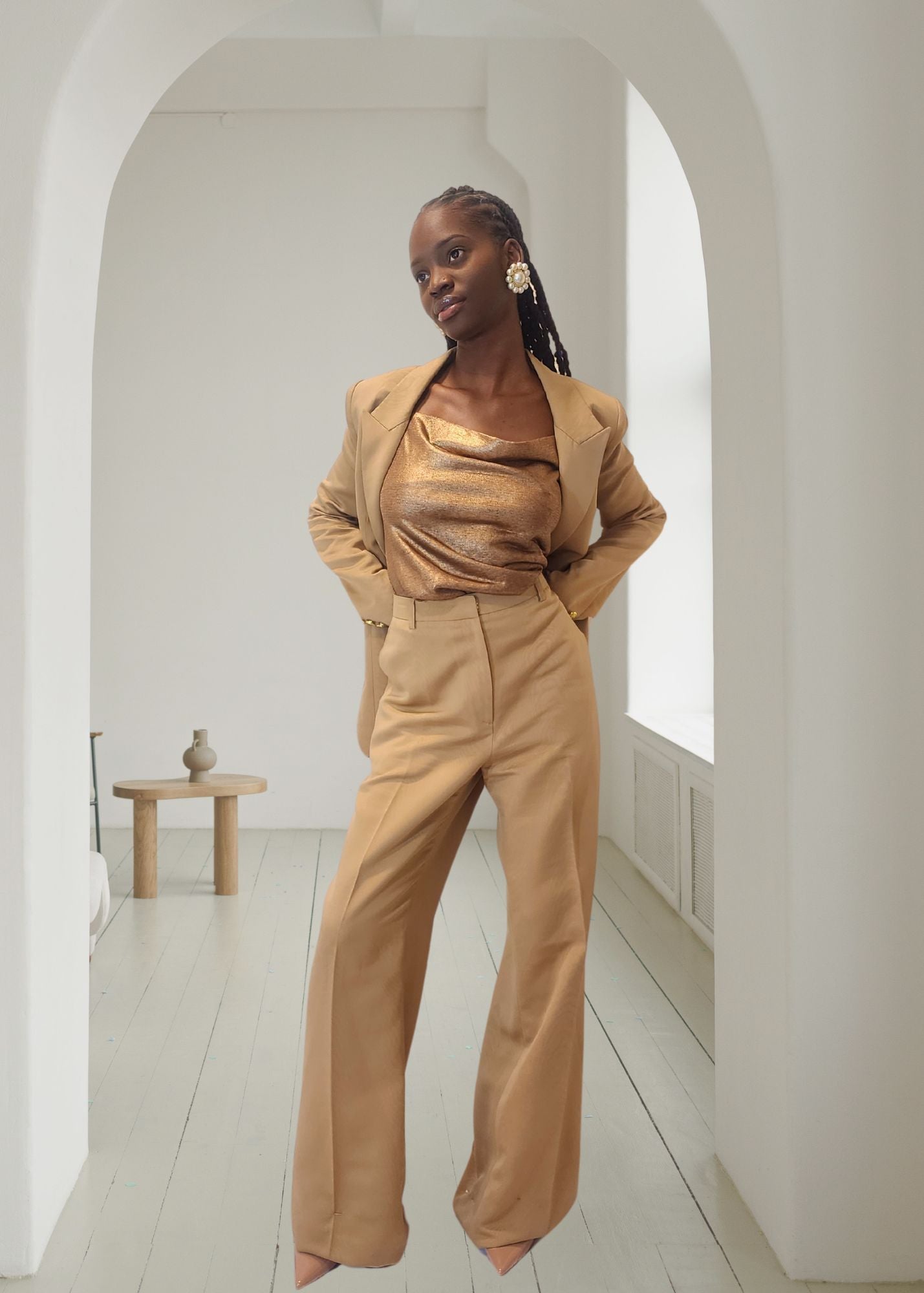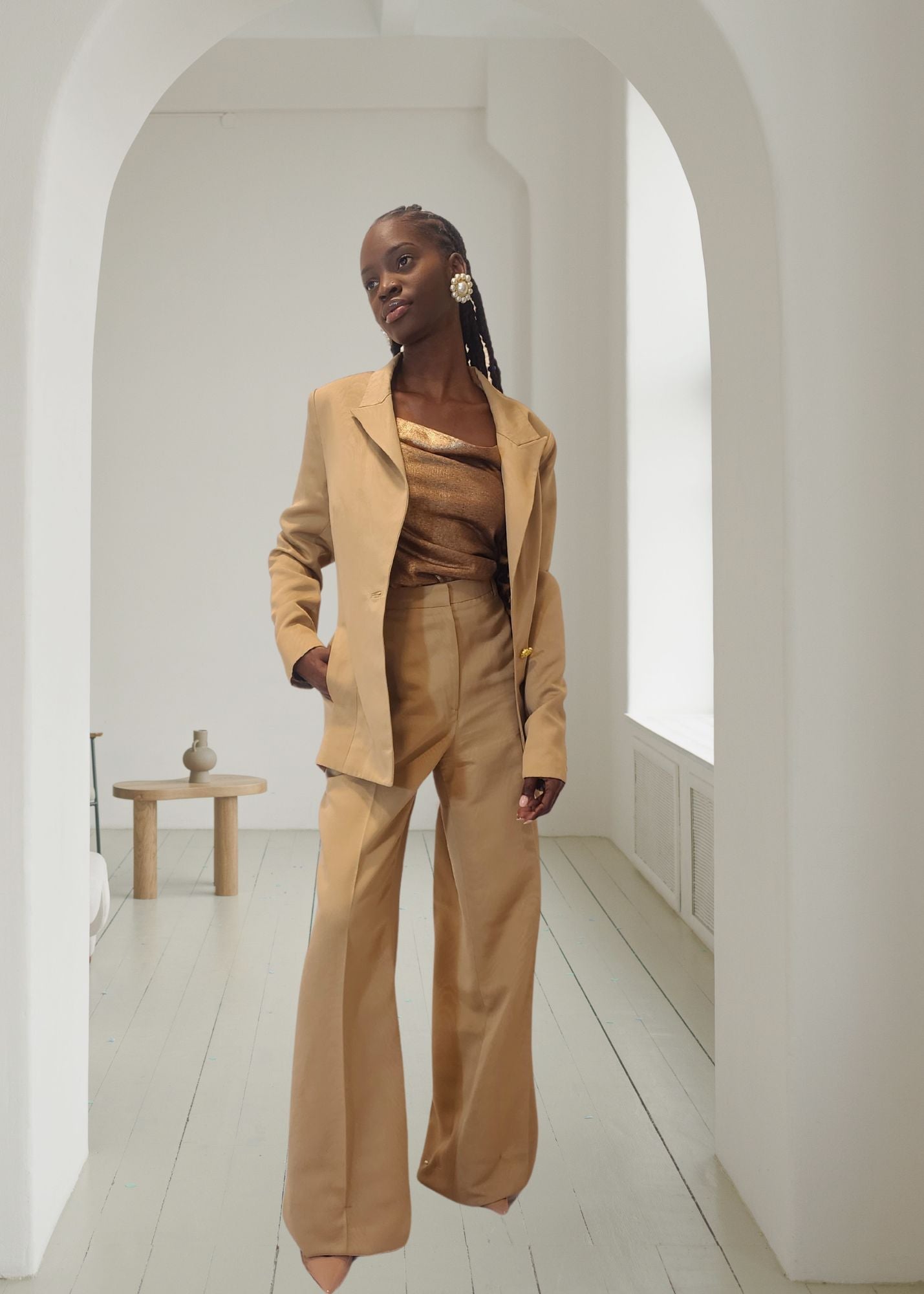 If you caught her on the red carpet of the 2021 Met Gala then you like us were gobsmacked at the incredible golden goddess get-up she graced the world with. Her career, poise and amazing beauty served as the muse for the making of this golden sand colored suit.