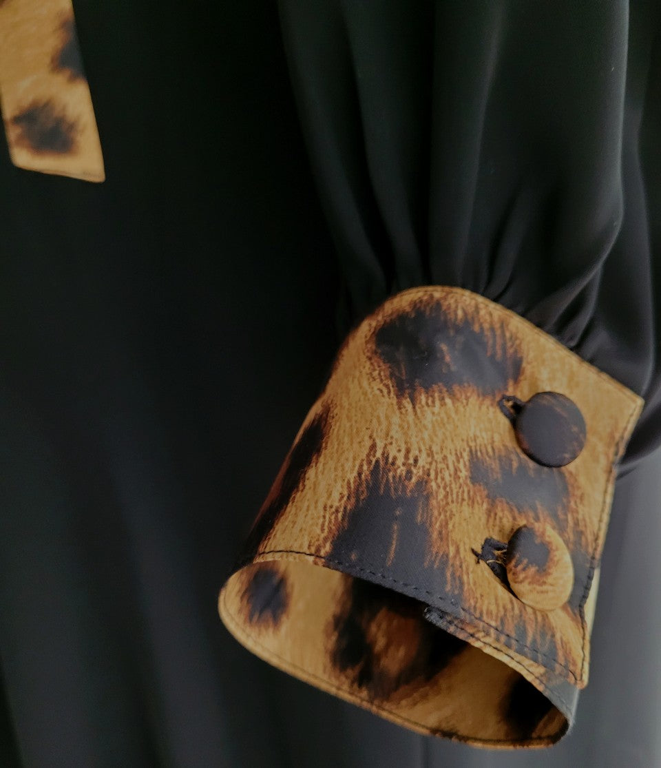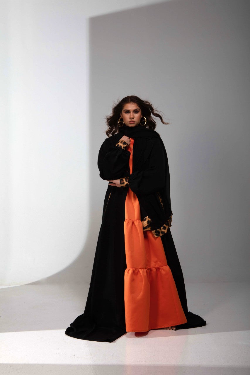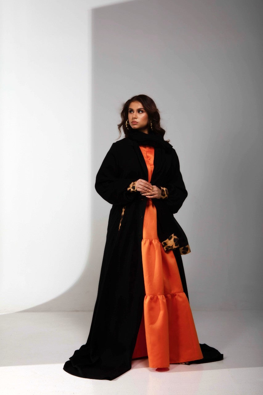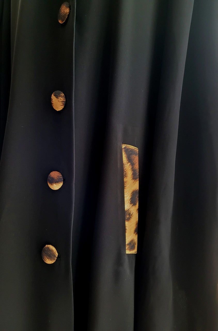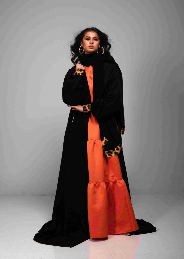 She was created out of necessity and respect for the local culture in the idea of the abaya and then elevated with our signature leopard print silk as a trim on the cuffs, buttons, pockets and scarf/shela. The western influence was that or the blazer style lapel and enclosed cuff as well as pocket details.