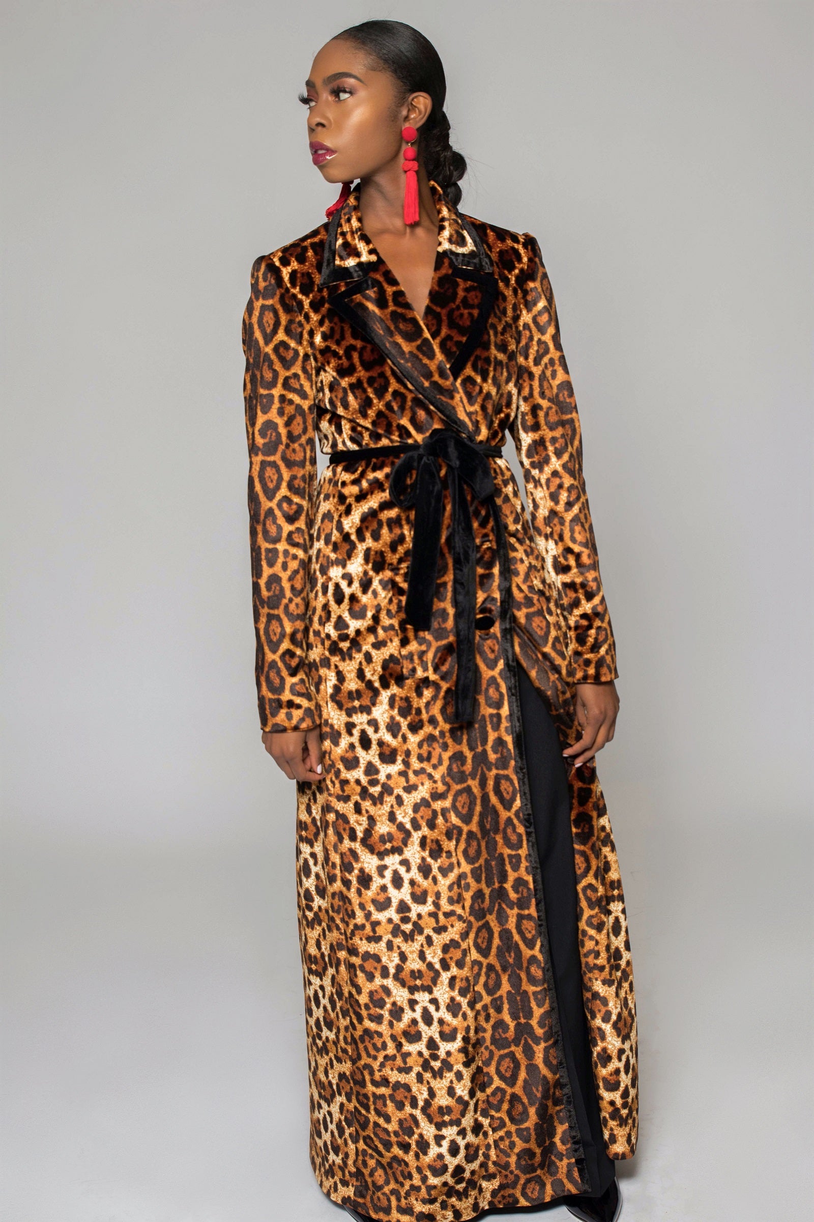 The "Kitt" is a luxurious leopard print velvet, with black velvet trimmed lapels and 3 button detail. She comes with two front pockets, can be worn belted or without and is lined with black lining as well as a back vent for movement.