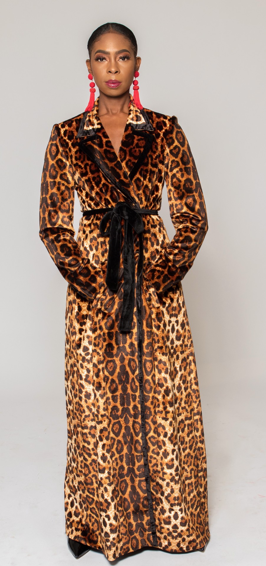 The "Kitt" is a LIMITED EDITION luscious floor length trench coat dress made from a leopard print velvet and inspired by the femme feline fatale known as Eartha Kitt aka "Catwoman"